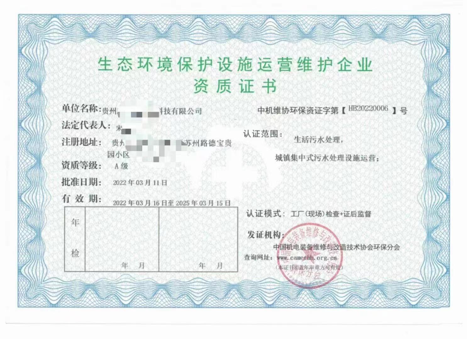 經(jīng)過初審、現(xiàn)場審核、復(fù)審?fù)ㄟ^的企業(yè),由中國機電裝備維修與改造技術(shù)協(xié)會環(huán)保分會統(tǒng)一頒發(fā)《生態(tài)環(huán)境保護設(shè)施運營維護企業(yè)》資質(zhì)證書。